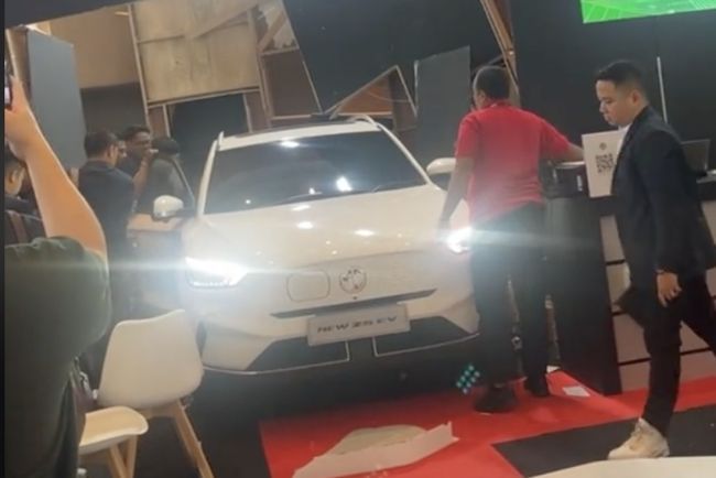 Dalam video yang diunggah oleh akun youtube @konsultanotomotif terlihat kendaraan MG ZS EV berkelir putih tengah dalam kondisi aktif dengan lampu depan menyala. Kendaraan tersebut berada di posisi menabrak backdrop atau latar panggung booth MG ZS EV yang berada di GIIAS Bandung.